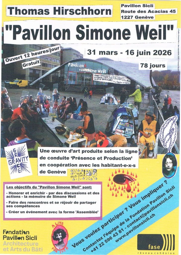 L’artiste-plasticien Thomas Hirschorn a pour projet d’honorer la mémoire de Simone Veil au Pavillon Sicli, dans un projet intitulé Pavillon Simone Veil.Parmi d’autres initiatives impliquant des habitant·e·x·s de Genève, une pièce sera créée en collaboration avec des participant·e·x·s de REVA, et jouée entre le 31 mars et le 16 juin 2026.L’idée est de se rassembler…